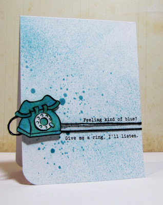 My card features an oldie but goodie set by Lawn Fawn, Just My Type. I colored the phone, trimmed it and then mounted it onto a misted panel that had been printed with a sentiment (done up on my word processing system). A long piece of floss replaced the stamped cord and wraps around the card front. Kind of reminds me of the Telephone Game where you take two tin cans and a length of string...