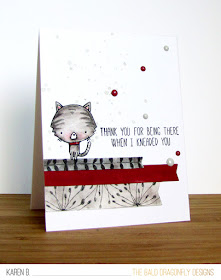 I'm playing along with the MFT Color Challenge #57, and their Share the Love Campaign. I started by stamping and coloring one of the cute kittens from Cat-itude and some custom banners with Sketched Blooms. I splattered some gray ink onto a white cardbase, stamped the sentiment and adhered all the stamped elements. I finished the card with some Nuvo Drops.
