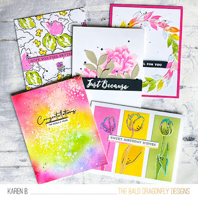 The following photographs showcase the five feminine cards together and the five masculine cards together. I used colors, the treatment of the sentiments, splatters and a similar design to create two cohesive sets that work together but work as a set when given individually as well.
