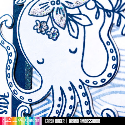 The super cool, super sweet focal point of the card is the amazing octopus from the Ocean Chums Stamp Set which was stamped simply in Cove Blue and accentuated with glue and glitter, then die cut using the coordinating Ocean Chums Dies.