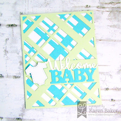 I started my baby card with a white card base and die cut the Cover Up Die: Diagonal Plaid in mint and baby blue cardstock. These were layered over the white card base, and then I accentuated the plaid with a cute little onesie from the Baby Onesie Shaker Die and from and a sentiment made from the Welcome Word Die and Baby Word Tag Dies.